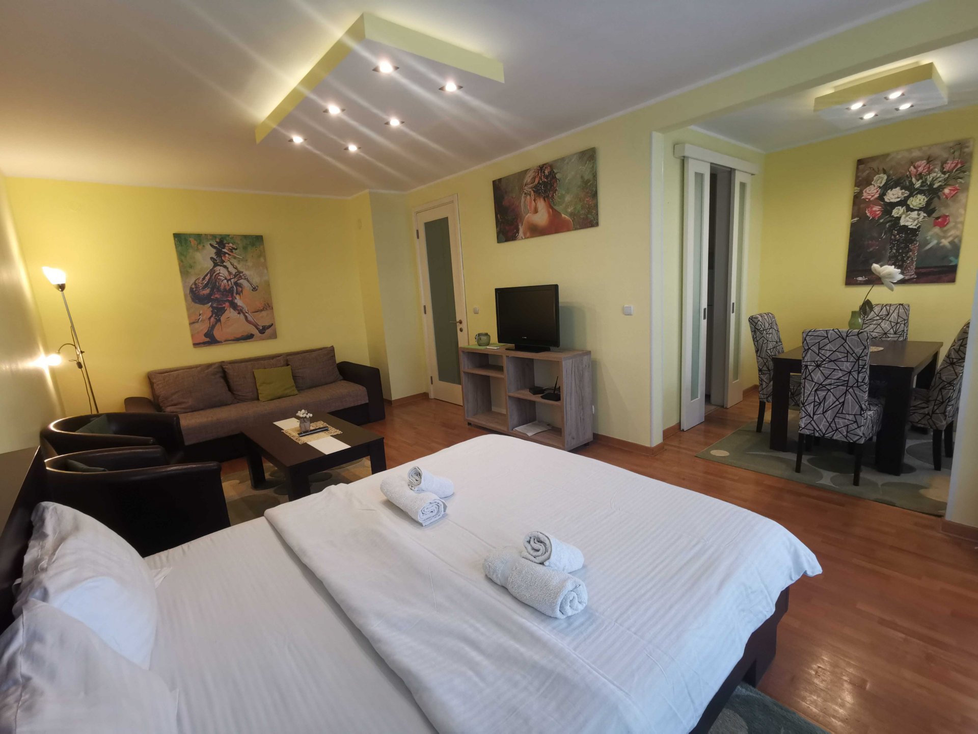 This amazing one bedroom apartment offers a cozy and spacious living room with a beautiful view from the balcony. One bedroom has a Double bed while the living room has a separate Double bed as well as sofa making it perfect for a family vacation. Also has a fully equipped kitchen, Wi-Fi connection and a bathroom done to the smallest details ensuring a relaxing stay for its guests.