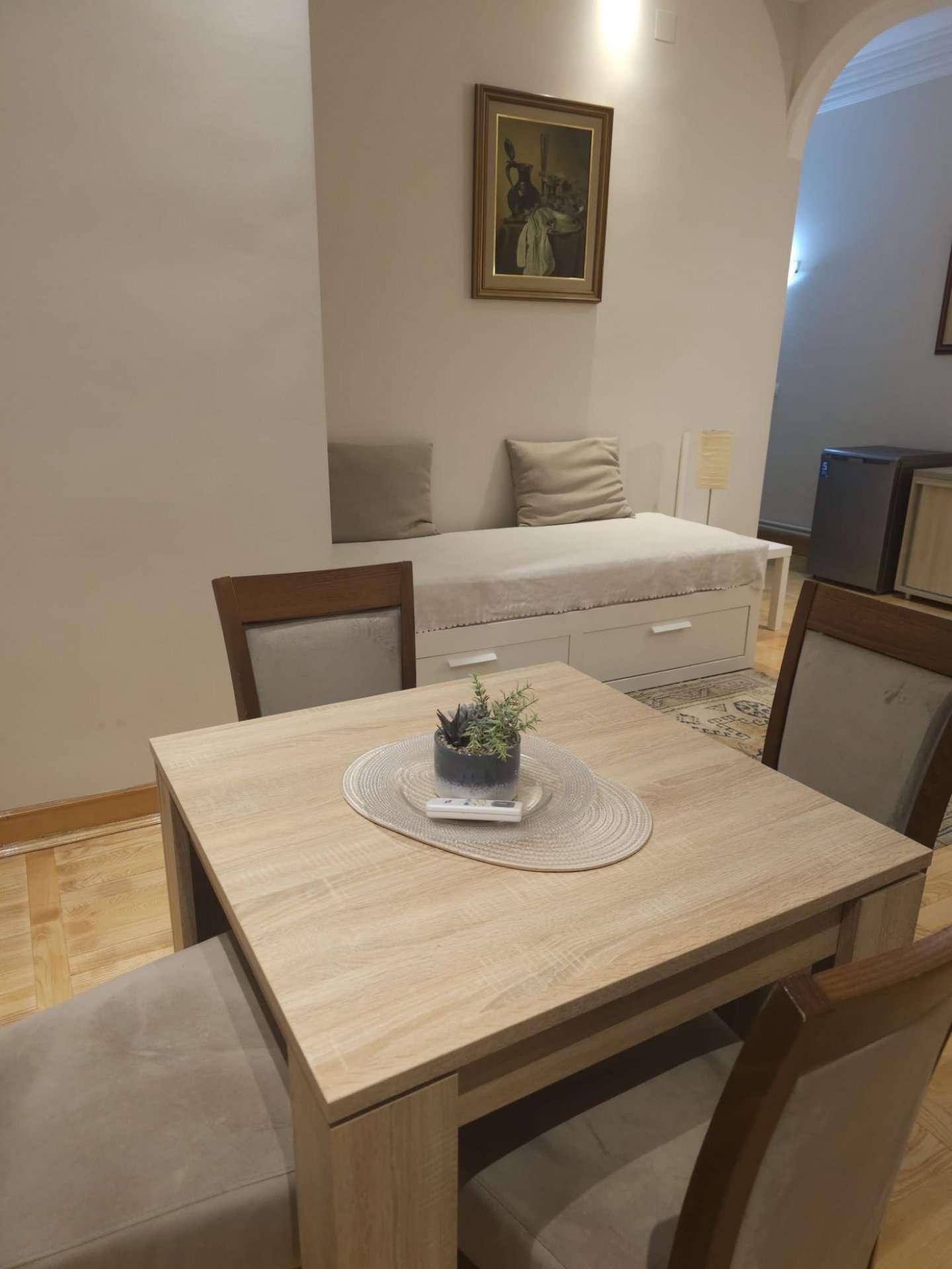 This spacious unit features a large bed and a sofa bed, providing ample sleeping space. It is equipped with air conditioning for comfort and free Wi-Fi for convenience. The unit includes a small kitchen for meal preparation and a private bathroom with a shower cabin and towels. A dining area with a fridge is located in one part of the unit, while the other part is furnished with a TV and a couple of night tables around the bed, adding to the overall comfort and functionality of the space.