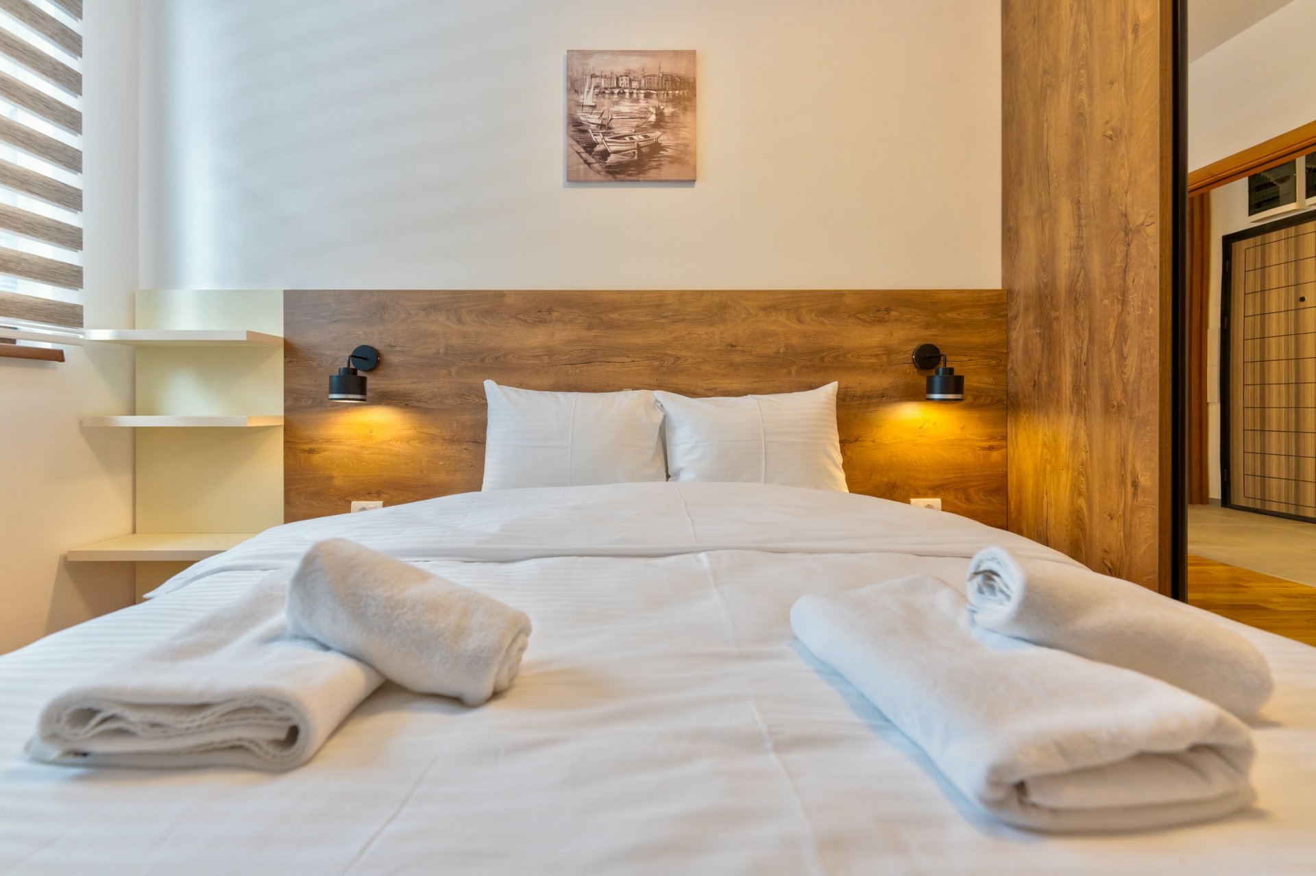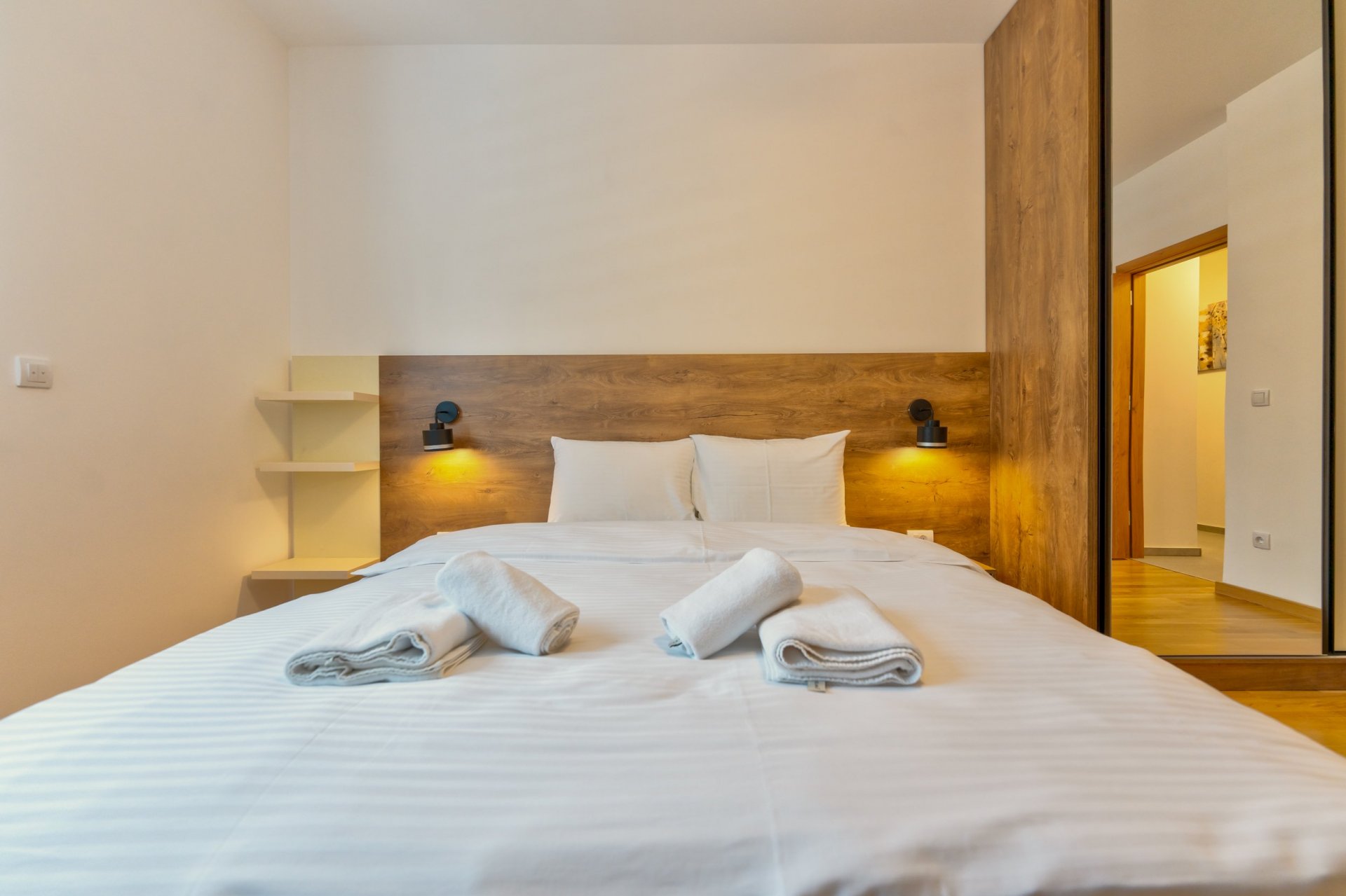 The apartment features a spacious living room perfect for relaxing or entertaining, and a private balcony that offers breathtaking views—ideal for enjoying your morning coffee or an evening drink. This 2 bedroom apartment is tastefully decorated with high-quality furnishings and soft lighting, creating a warm and restful atmosphere. The fully equipped kitchen includes modern appliances, cookware, and everything you need to prepare meals at your convenience. Guests can enjoy complimentary high-speed Wi-Fi, making it easy to stay connected during your stay.